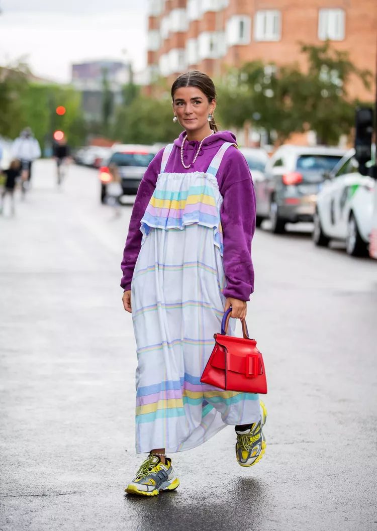 Wear a non-bulky, thin hoodie under your maxi dress if the weather drops. You can then complete the look by adding a pair sneakers to add a fun and unexpected touch.