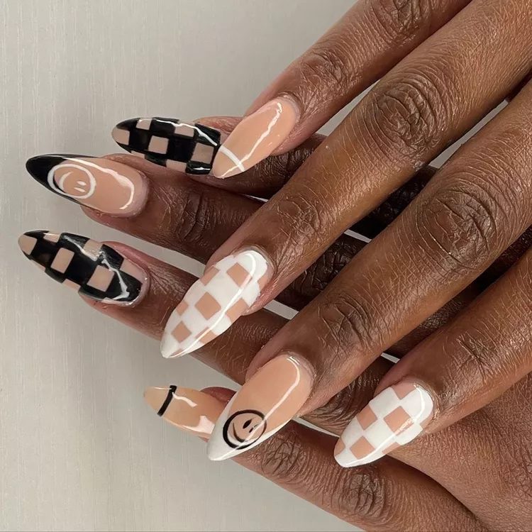 Tara Haye, Nailing Hollywood’s artist, says that almond-shaped manicures are the perfect balance of a sharp point with a gentle curve. This trendy almond-shaped manicure features black French tips with checkers and smiley faces, as well as a mix-and-match design.