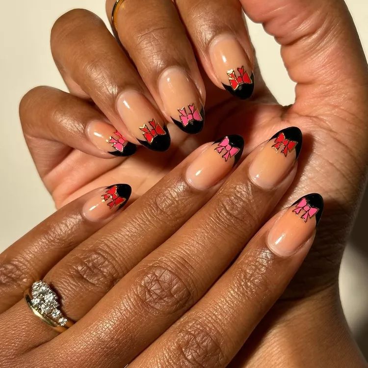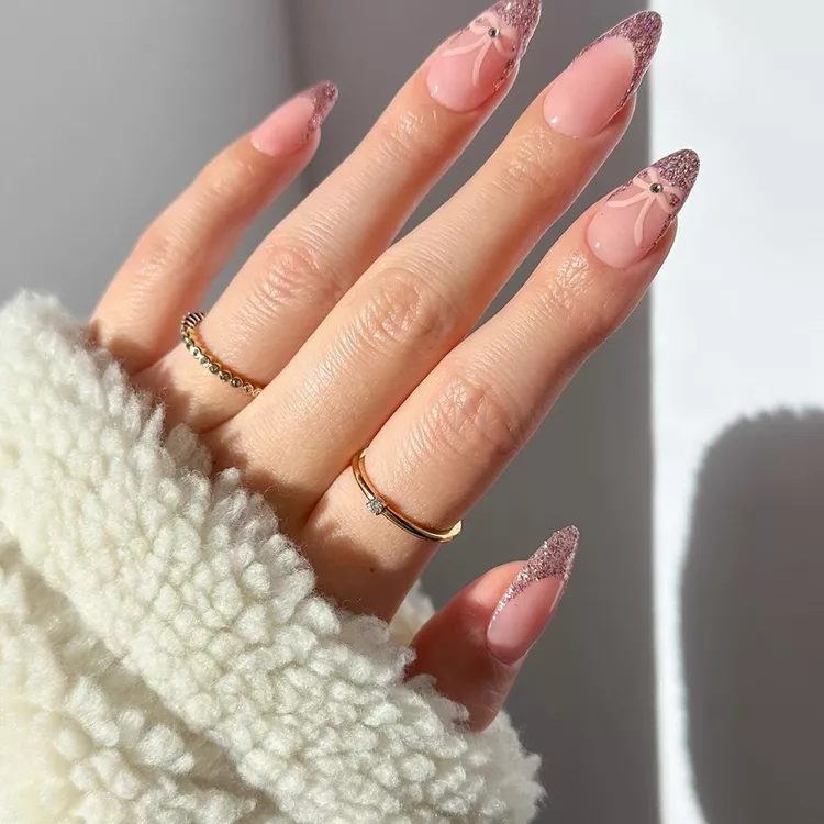 Bows will be a major fashion trend in 2024. Try a pink glitter nail polish with a ballet-pink bow to elevate your almond shaped French manicure, as Dayanna I did. Sapiens did this.