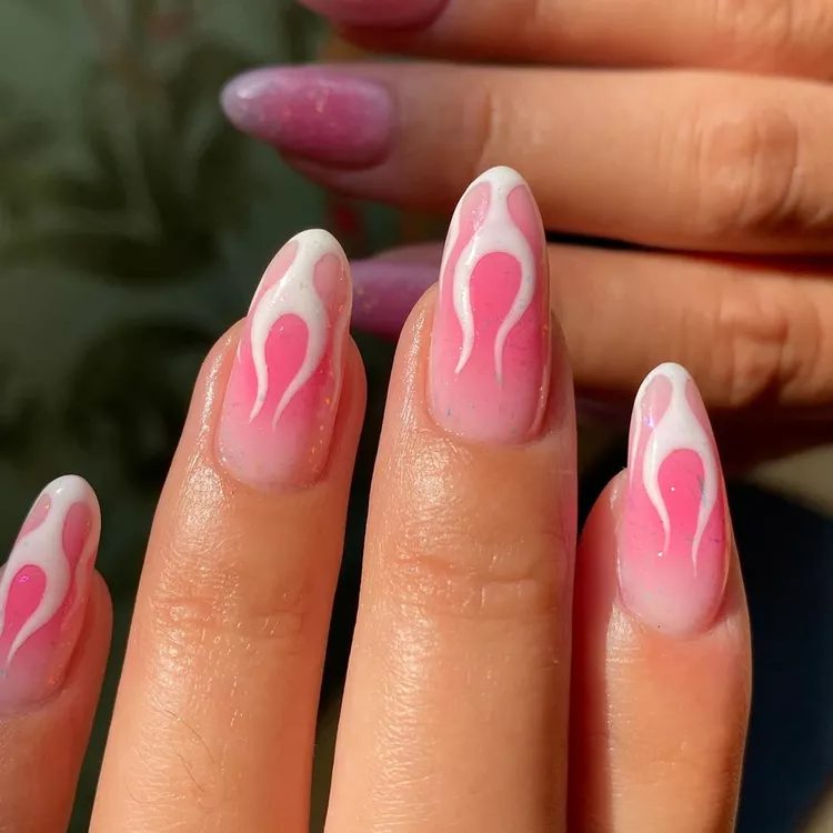 This is not your typical French manicure. Trendy is the choice of flames instead of crisp crescent tips. You’re sure to see a few flame manicures if you scroll through Instagram and TikTok. Joseph started with a pink base to create this nail art.