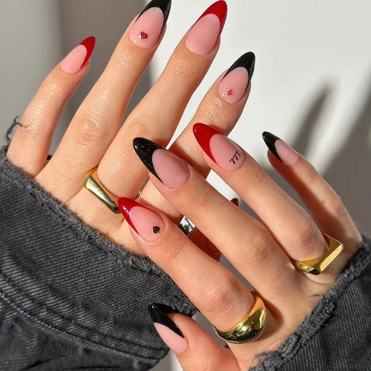 This French manicure in black and red is perfect for a Vegas getaway. It’s perfect for Sin City because of the tiny card suit detailing and lucky angel number.