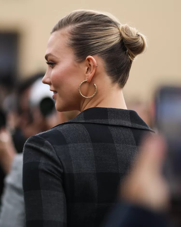 Karlie Kloss’ side-part bun is a stylish twist to putting your hair up. Start by parting the hair to one side and then gathering it into a neat ponytail. Wrap the ponytail at its base with bobbypins for a neat look.