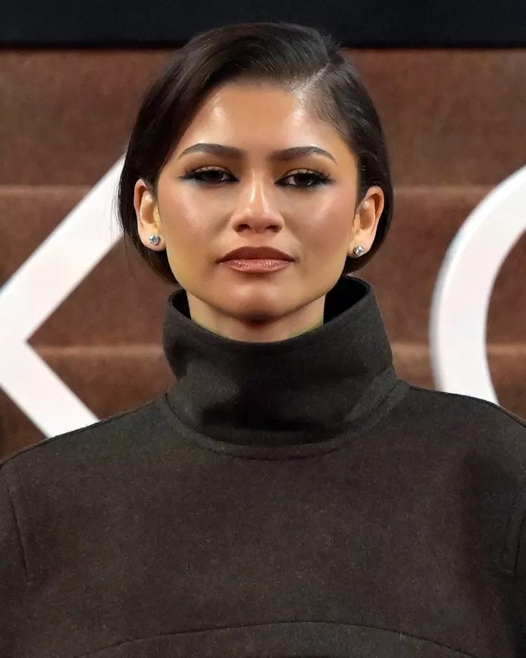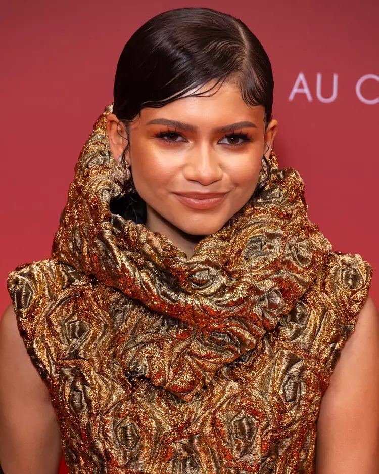 Consider a side-part bun with a wet look and styled edges for a stylish, edgy look inspired by Zendaya. Hurtado says to start by parting the hair on the left side, and then slicking back your hair with a gel or mousse that has a high hold. Gather your hair in a high bun and ensure the sides are sleek and smooth. To create defined edges, use a fine-toothed comb or small brush. To enhance the look of wet hair and to keep flyaways away, finish with a glossy edge control or serum.