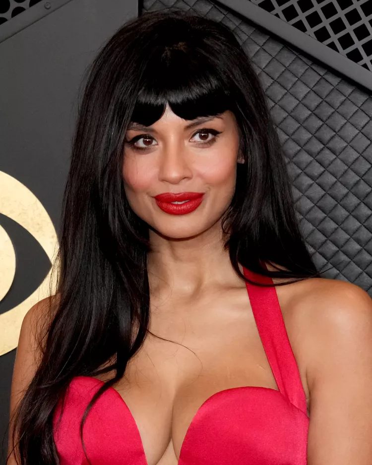 For Jameela Jamil’s tousled hair, with a side-part and bangs that are effortlessly styled, apply a volumizing hair mousse on damp hair. Then blow-dry it with a round brush for added volume. Create a deep side section. Curl random sections of hair, away from your face, with a curling wand. Hurtado says that after curling the hair, you can tousle it with your fingers or using a comb. This will give it a more relaxed and lived-in appearance. Use a light hairspray at the end to keep the tousled texture and style in place. Use a paddle to flat-wrap your bangs until they are smooth and tame. You can use a round brush for bounce and then brush it out with your fingers.