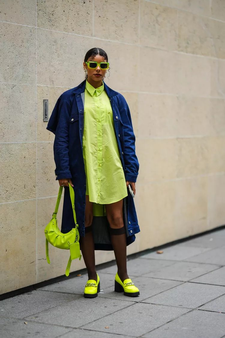 Picking a bright color to be the focus of your next dress-and-loafers look is a great way to make ‘it seem effortless’ and create maximum impact. The OOTD look is achieved by using a vibrant lime green or icy metal throughout your outfit from head to foot, tempered with dark neutrals.