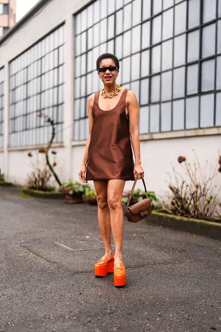 You can’t go far wrong with a mod dress and platform loafers for a vintage-inspired dress and loafer look. This outfit has the same energy of the mini dresses and go go boots from the past. You don’t have to use a lot of patterns or prints because each piece makes a big statement. Solid colors can be striking by themselves.