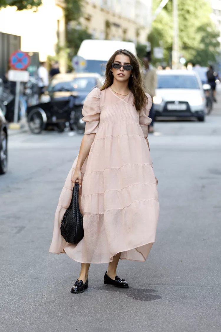 Wearing sensible loafers with sheer dresses will enhance their softness. For a coordinated look, choose sleek, minimal loafers, either in brown or black, and add a matching handbag.