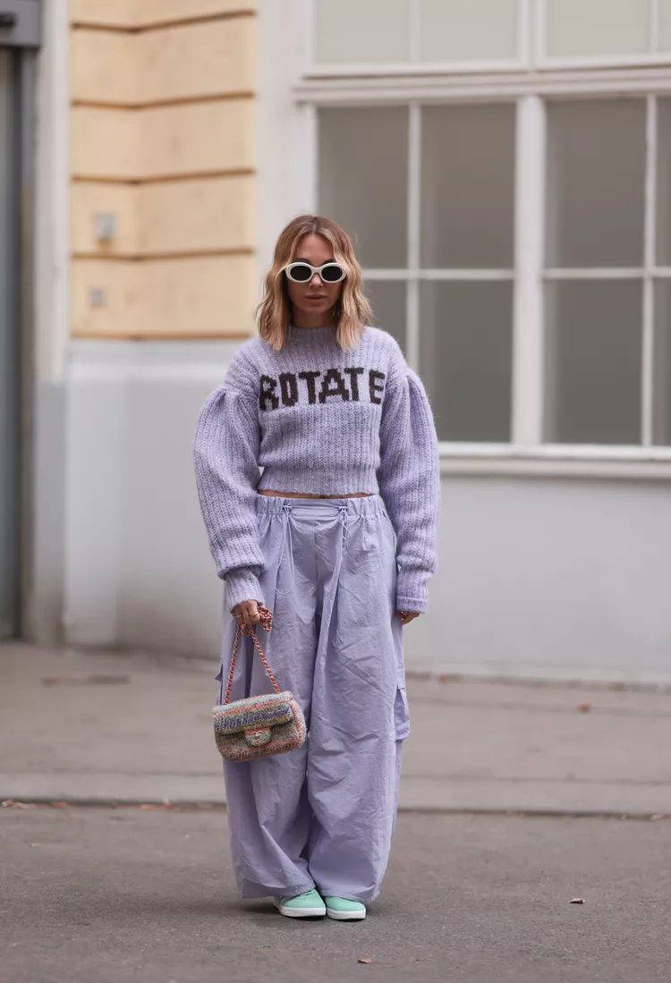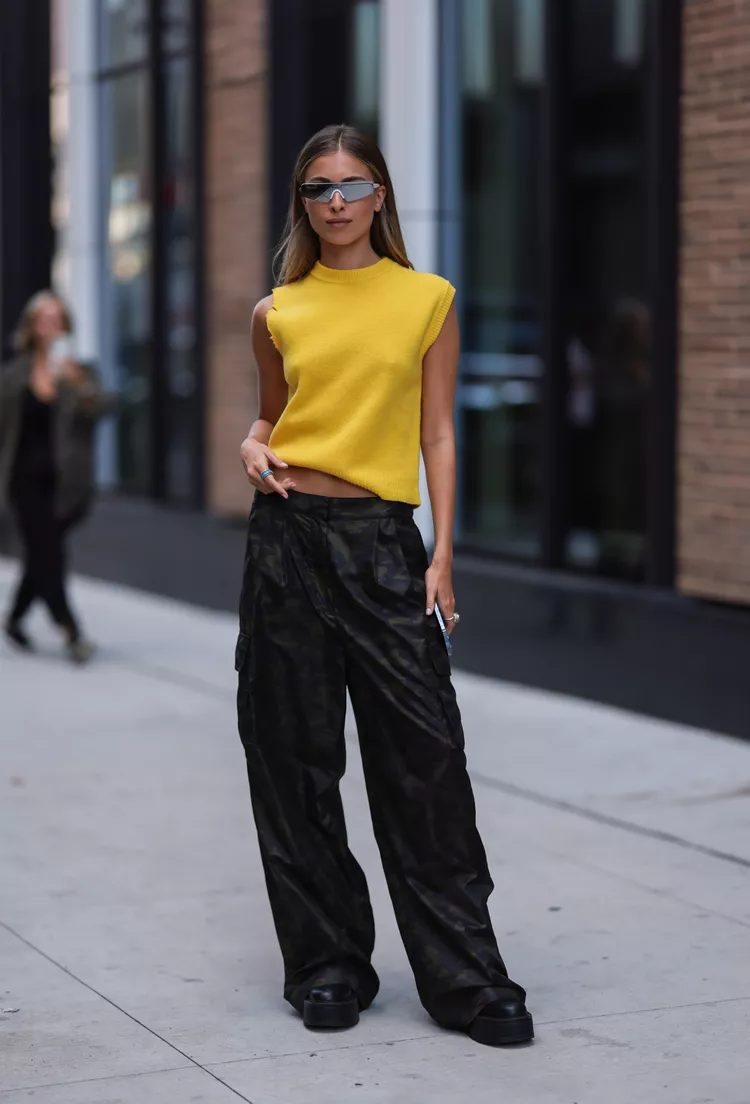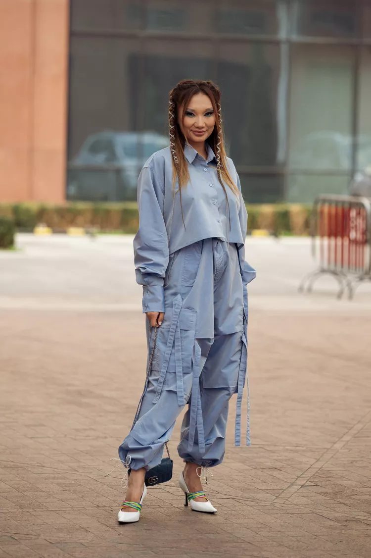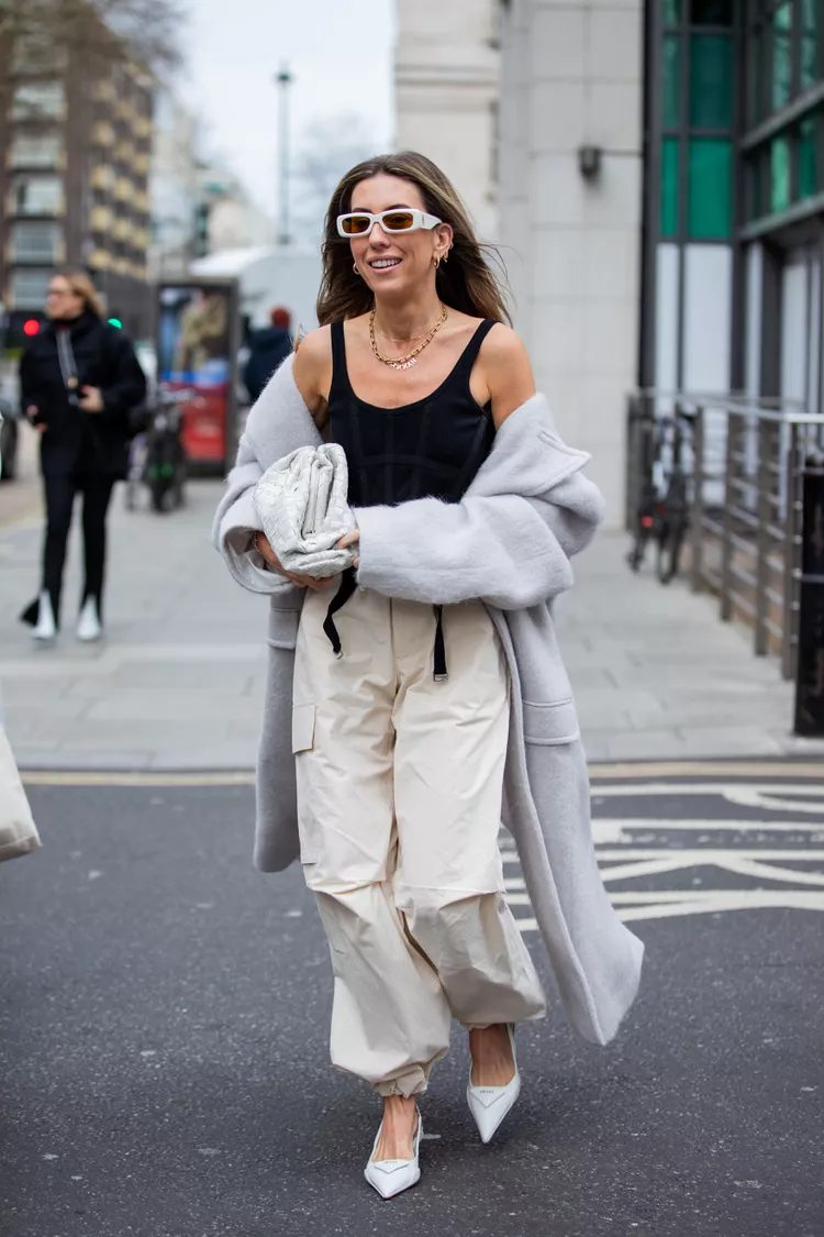 Parachute pants are a hybrid between cargos and track pants. They have the relaxed fit and volume of baggy pants, but the lightweight and sheen of swishy pants. You might think that parachute pants are only suitable for ultra-casual outfits due to their streetwear style and roominess. However, as these 11 looks prove, they are far from basic.