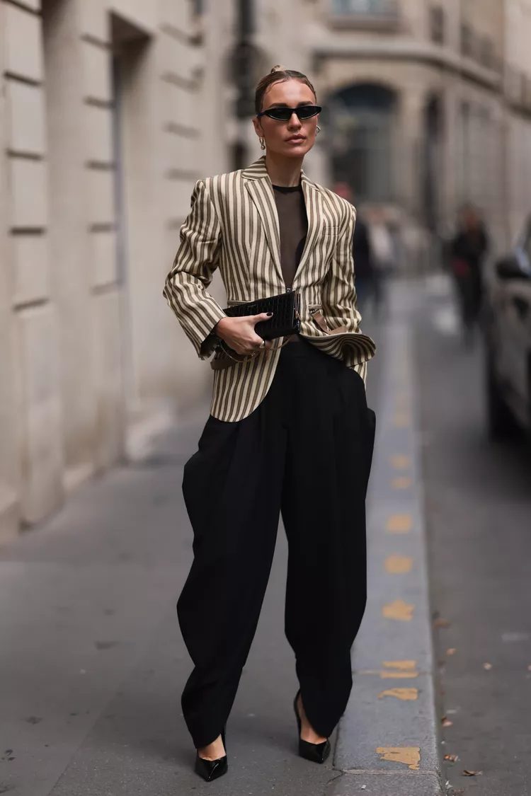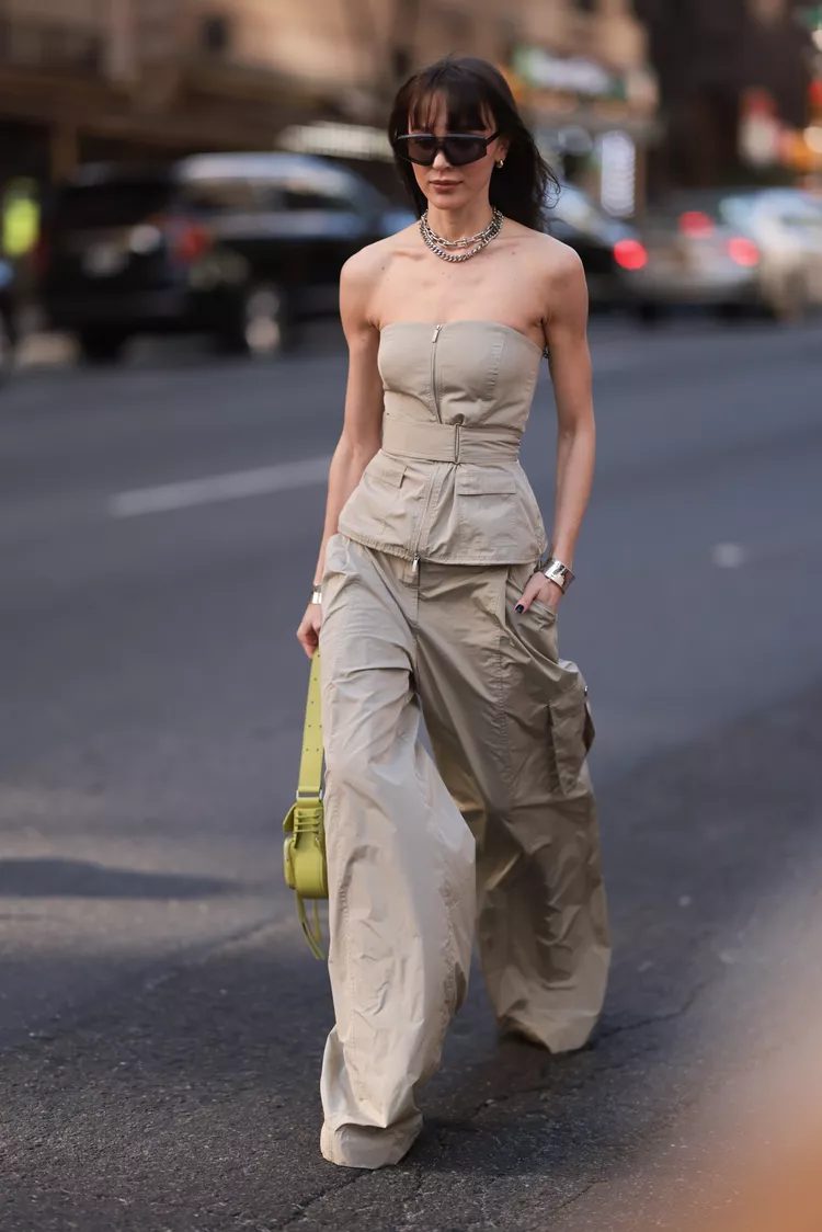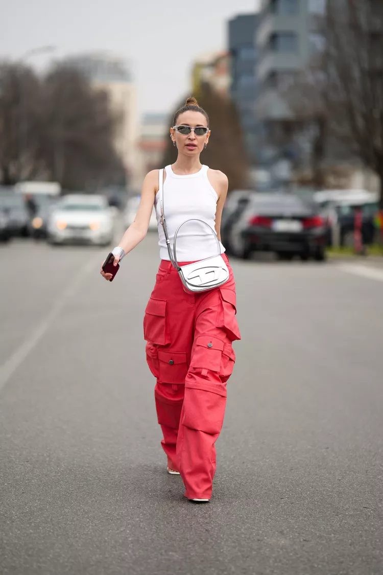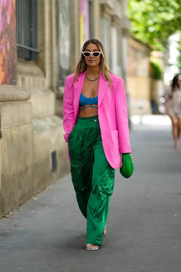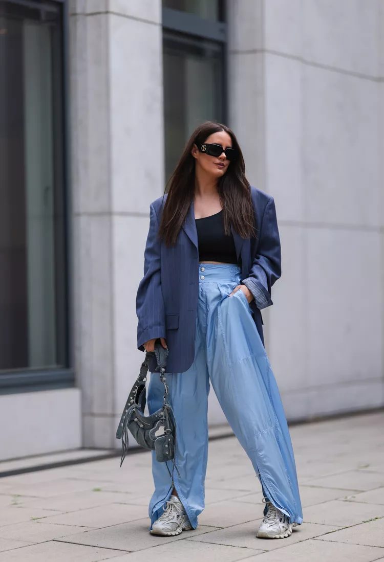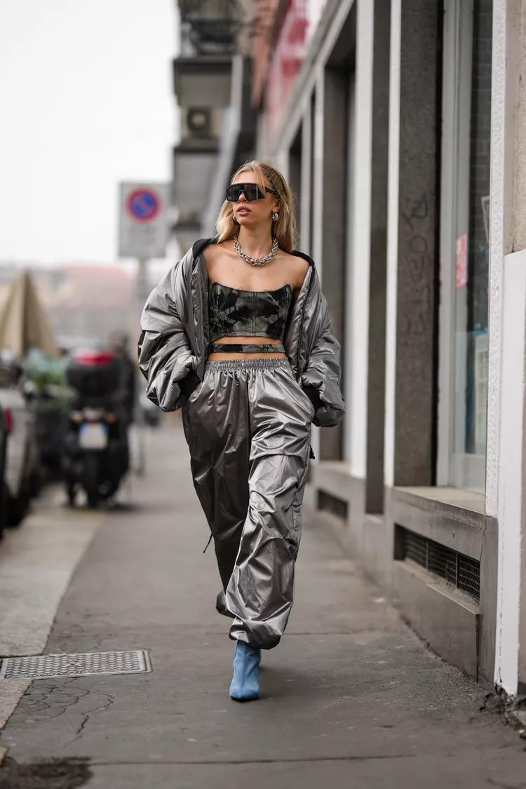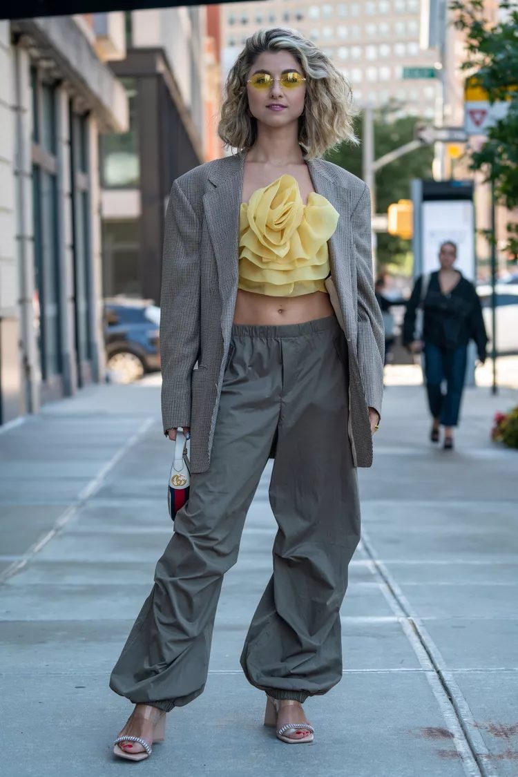 The rich history of streetwear makes parachute pants ideal for creating trendy outfits that mix bold and daring season separates. Wearing a bra or bralette with a boxy jacket creates an eye-catching silhouette.
