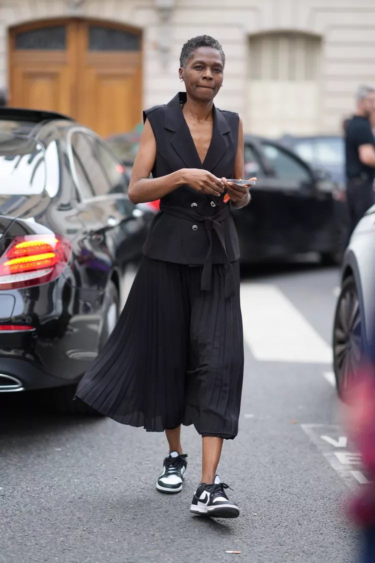 Why not opt for black separates rather than your classic LBD? This vest and pleated-skirt combo can be worn from daytime to evening. It can be dressed down or up by changing your shoes.