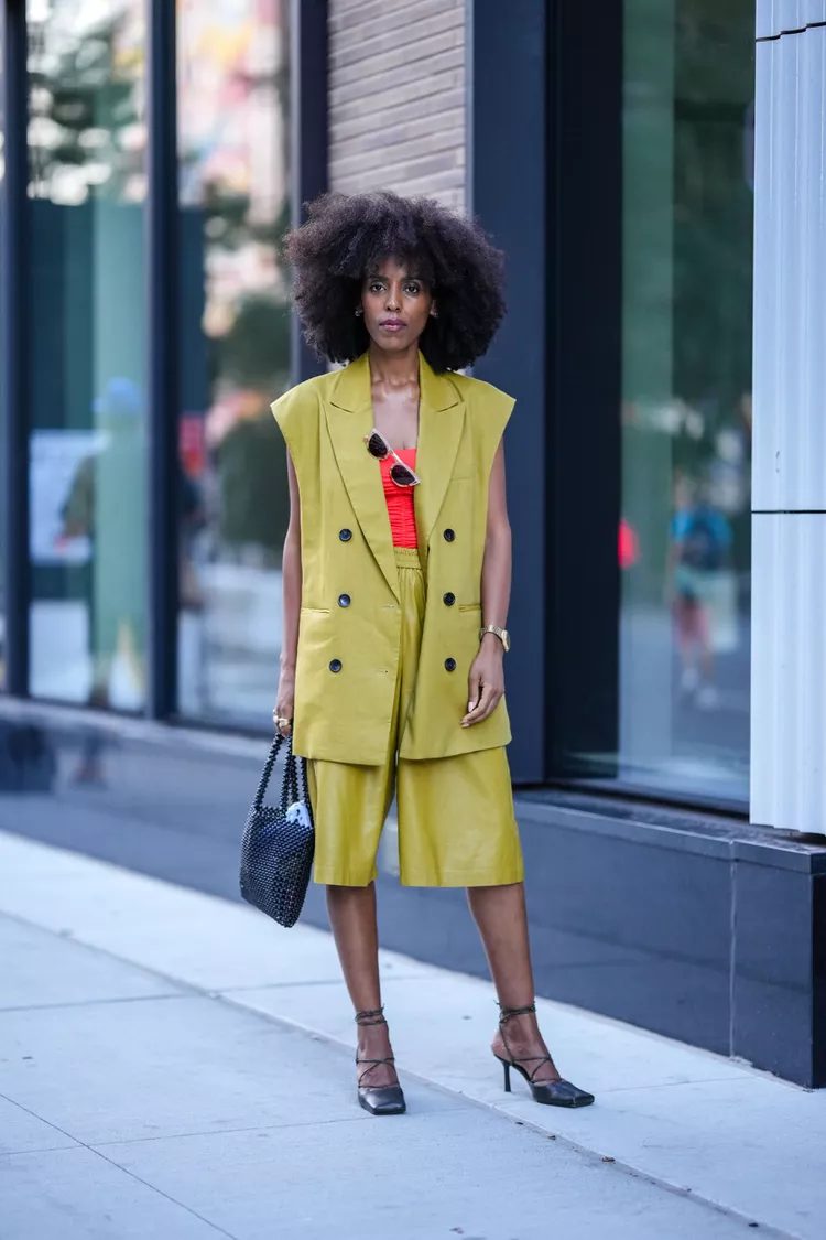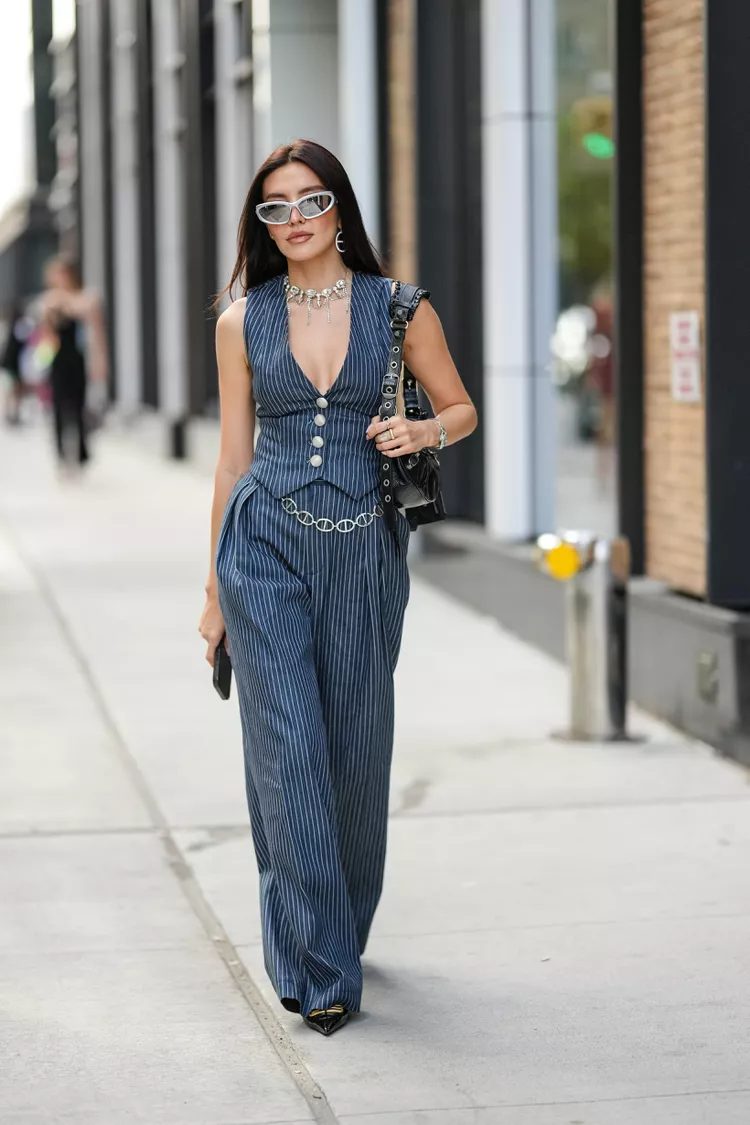 Summer suits are easy vests and pants made of lightweight cotton. This is a tailored look that’s both stylish and comfortable. Play with the buttons and show some skin with just one closure at the top. Wear a pair of chunky, oversized sandals and cool sunglasses to finish the look.