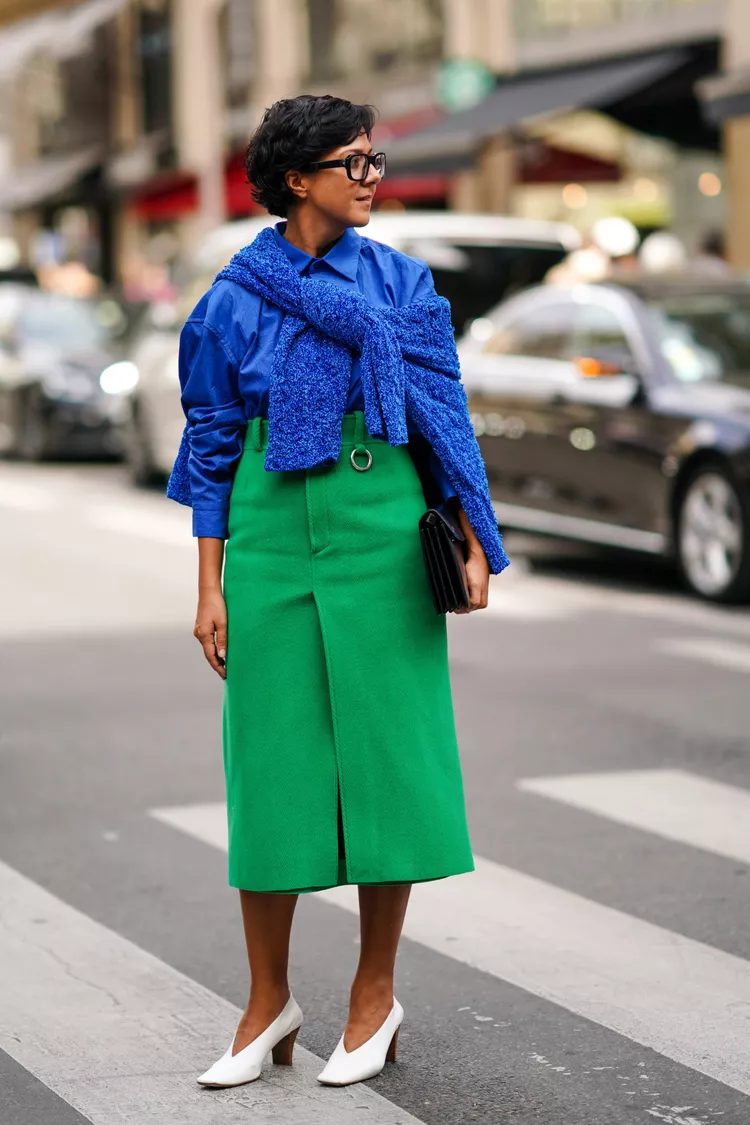 The two darker shades go well together because blue is one primary color used to create green (the second is yellow). Add a lighter shade by pairing it with white shoes.
