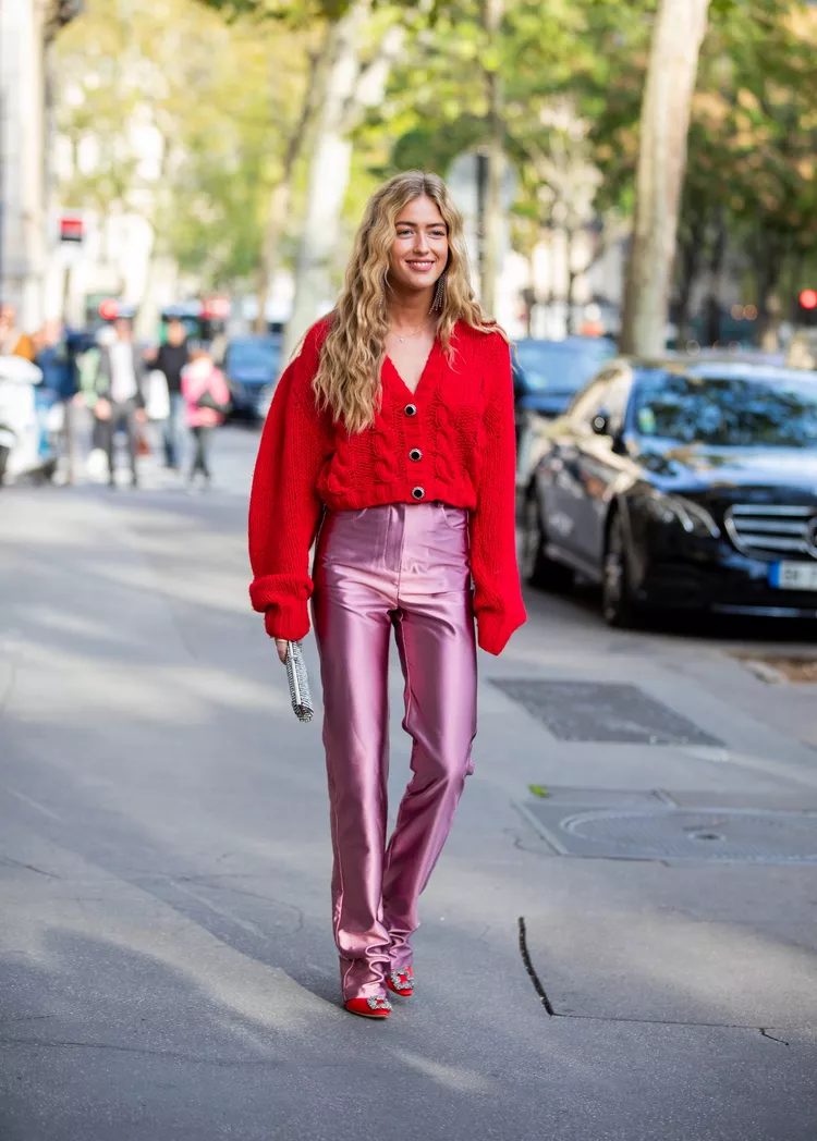 The color combination of pink and red doesn’t have to be reserved for Valentine’s Day. Over a pair pink metallic pants, a red crocheted top is stylish.