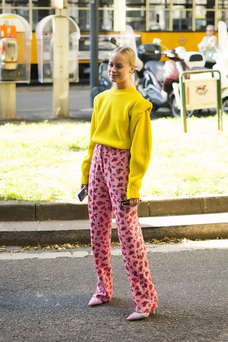 Color blocking can also be achieved by wearing the primary yellow color with a lighter color, such as pink. Prints can be used to add dimension to an outfit.