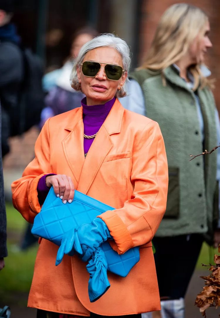 A bright orange is a good complement to purple. This outfit combines a purple turtleneck and an orange leather jacket, playing with colors and textures.