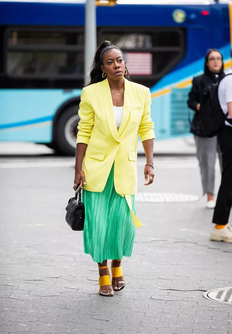 This outfit is not only a great example of color blocking but also of layering. The ruffled skirt is covered by the long, canary-yellow blazer. The garment brightens the ensemble and elongates your upper body at the same time.