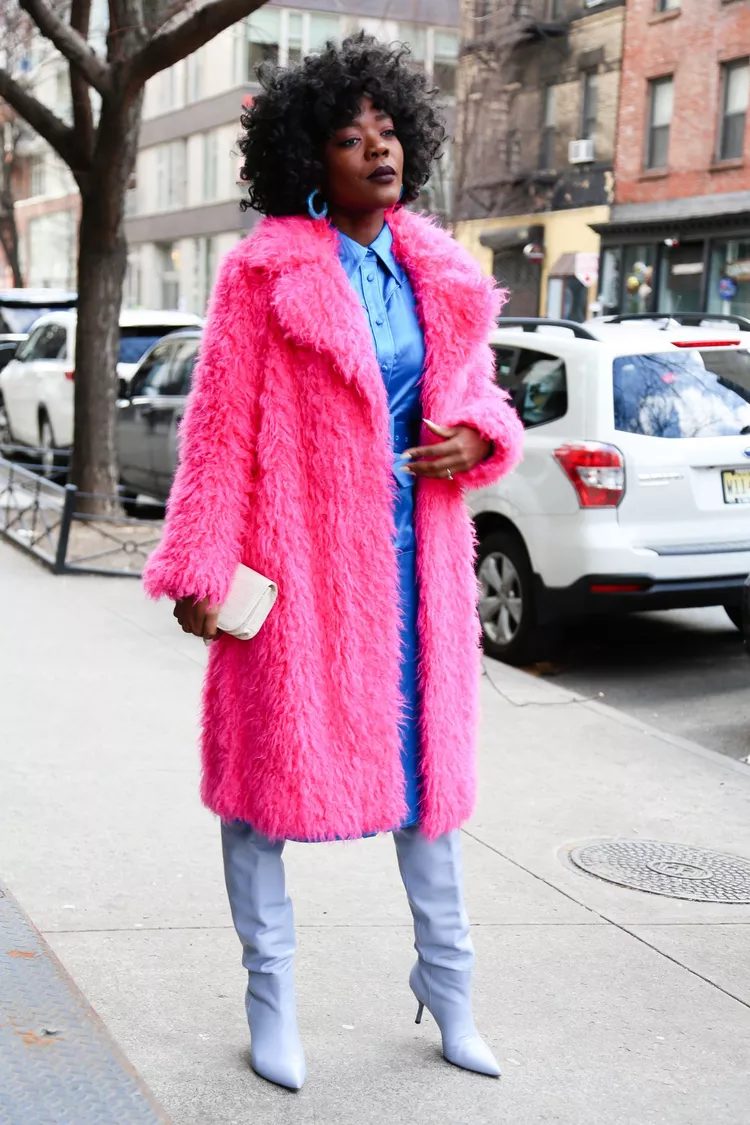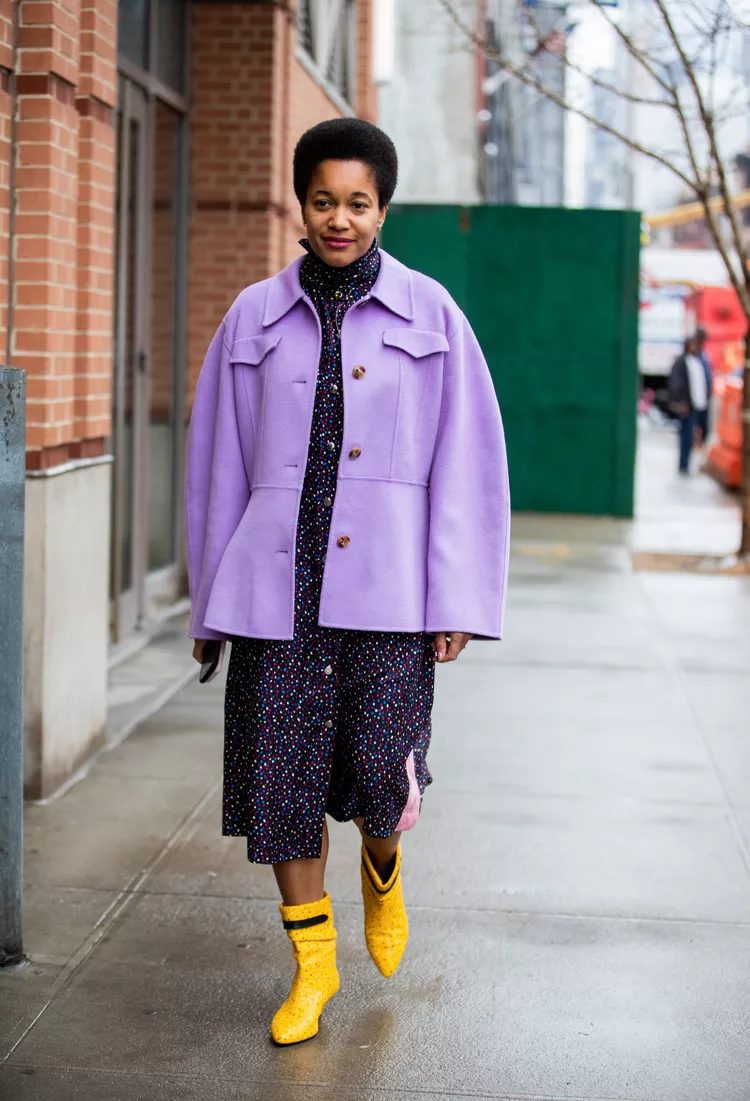 The model is wearing a light-purple coat over a dress in a deeper purple with yellow boots. Consider making the dress purple and the boots yellow. You can combine yellow and purple in a variety of ways.