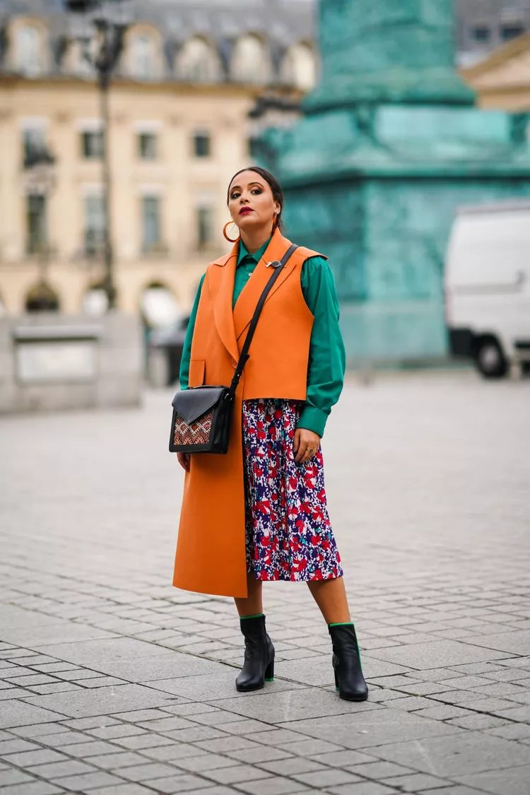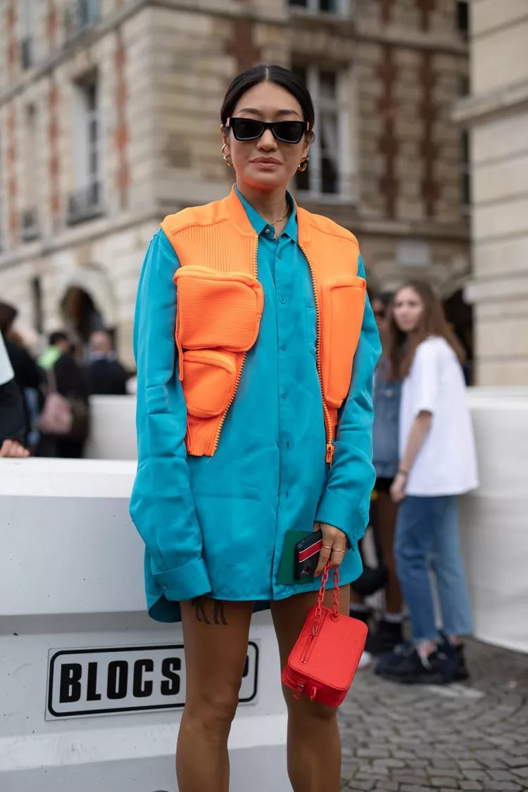 It’s not just about wearing a top and bottoms of different colors. You can color block your top by adding accessories, as shown in this model. The orange vest adds warmth to the cool blue tones.