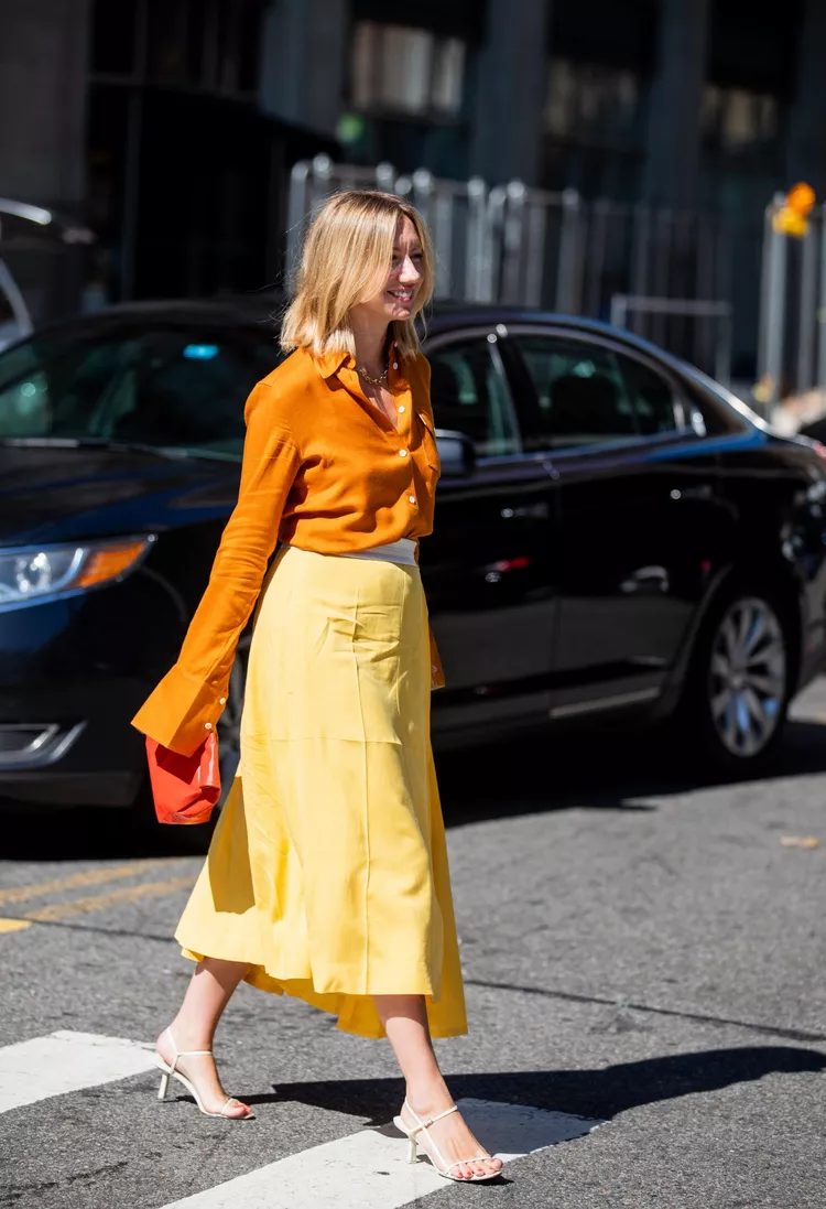 Consider pairing orange and yellow for an outfit that will make you look like the personification of flame. The model here wears a top in orange with a skirt in yellow, but it’s also possible to do the opposite.