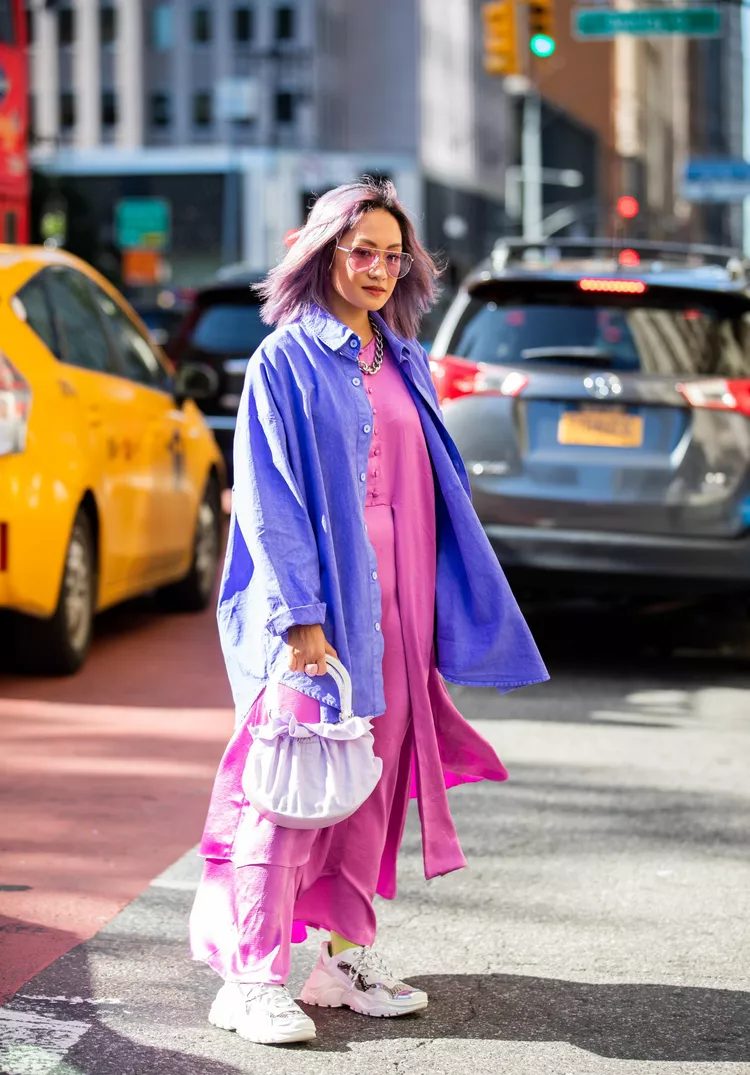 You can look like Barbie by pairing pink and purple. Wearing a pink top with a skirt in purple could help you achieve this look. As the model here does, you can cover up a dress in pink with a button-up purple top.