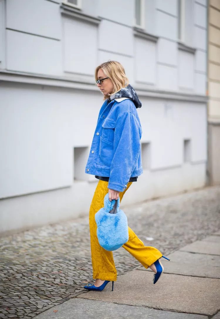 Blue and yellow are a great combination because they both have a bright color. The other one balances that brightness. To avoid the yellow being drowned out, we suggest wearing yellow pants with a pair of blue shoes and a jacket in blue.