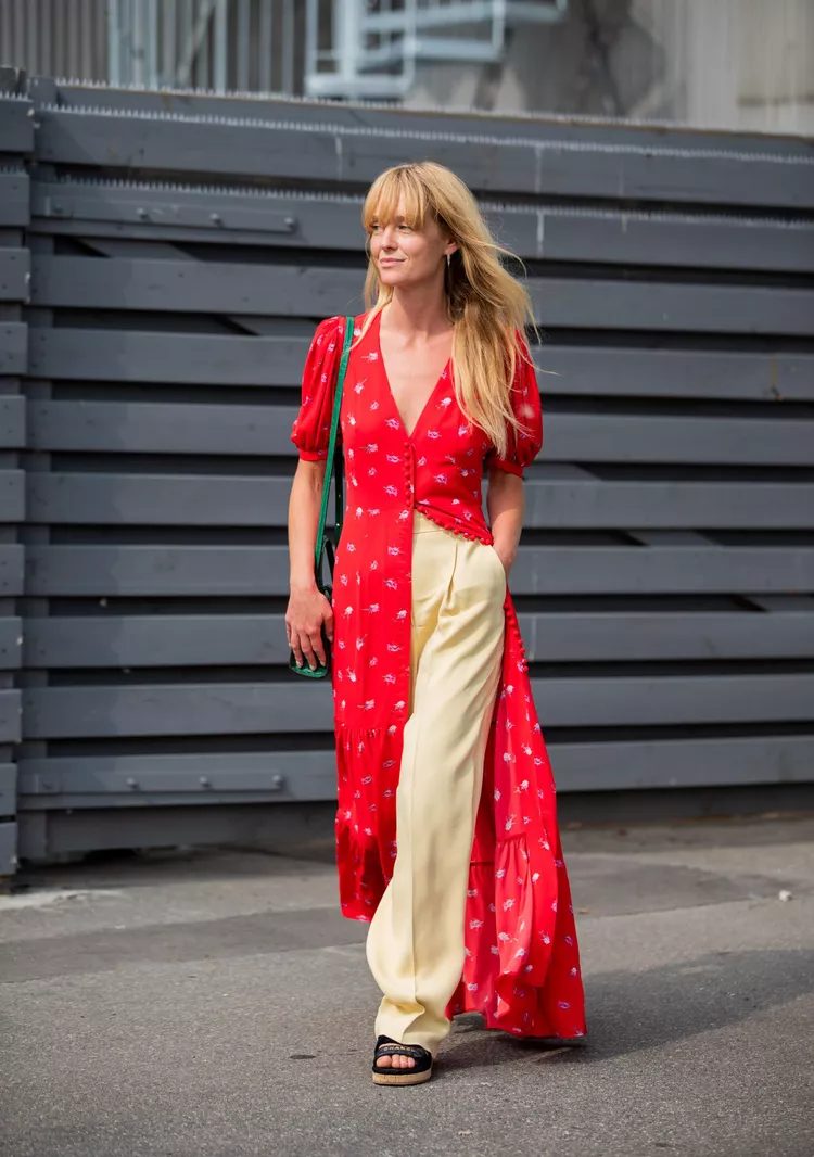 Two primary colors like yellow and orange tend to pair well together. This outfit combines a red dress with yellow pants. This is the best way to combine these colors. It can otherwise look like… a fast-food chain.