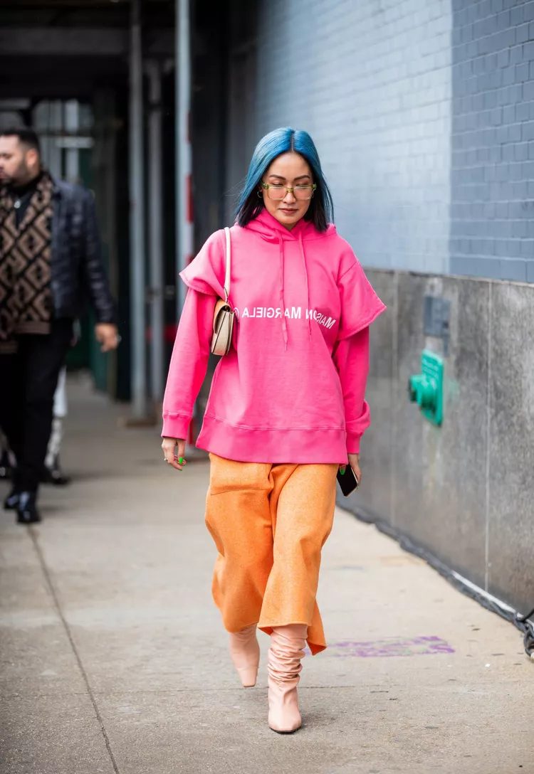The combination of two bright colors will also help to draw attention to the ‘fit. The model is wearing a hot-pink hoodie and peach orange pants in the photo, but you can also wear a skirt or top with a jacket on top.