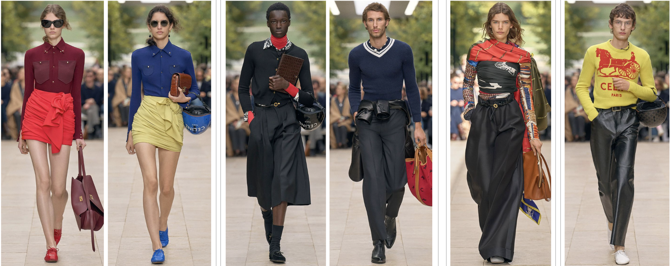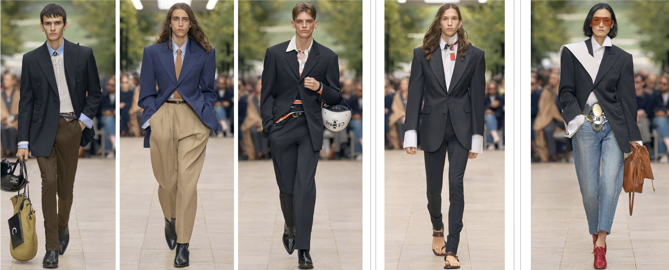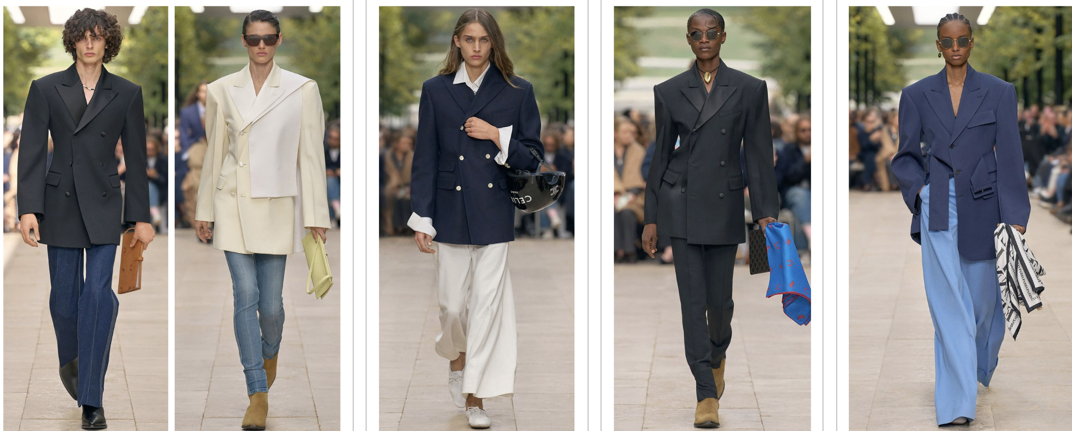 The gentleman’s suit is reimagined with a modern twist. The signature broad shoulders establish a silhouette of power, subtly embedding brand codes from the Philo era into its very shape. The palette of black and white represents eternal modernity, simplicity, and strength. The fusion of French elegance with American academia is seen in pairings of deep blue blazers with khaki trousers. For a seamless transition from office to everyday, the suit jacket is effortlessly styled with jeans.