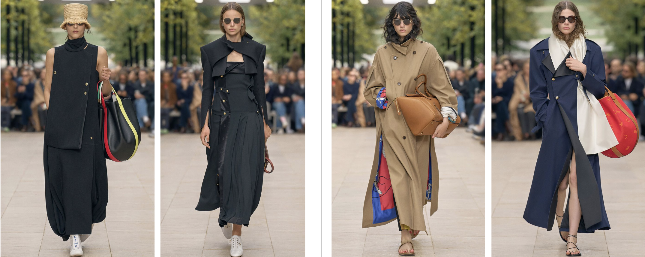 Comfort is paramount in these relaxed, fluid wide-leg trousers, championing a minimalist aesthetic of “relaxed commuting.” Paired with tailored pieces, they are ideal for business-casual settings, introducing a measured nonchalance that softens workplace formality. When combined with sporty silk-scarf print tops, they create a refined take on athletic.