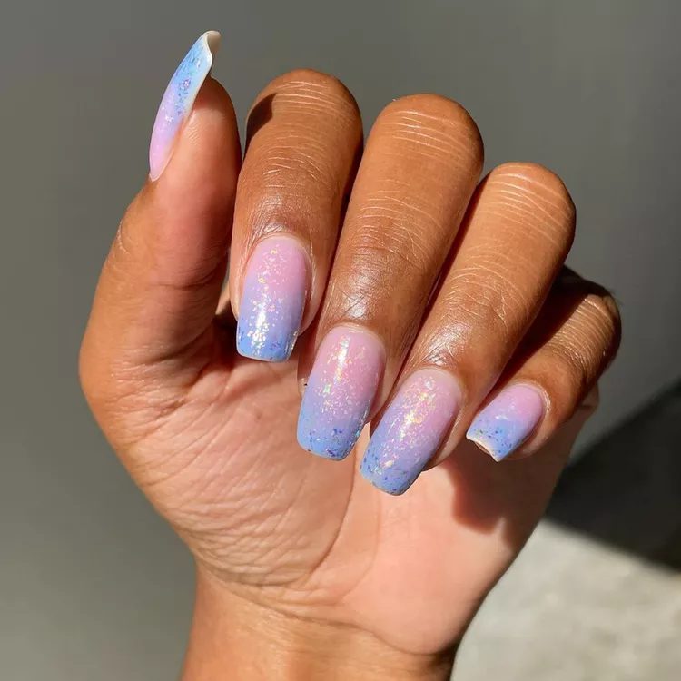 This pink and turquoise glitter ombre manicure would be perfect for a gender reveal. Use holographic polishes such as the Holo Disco Dust ($13), and Crystal Skies ($14) to create a similar effect.
