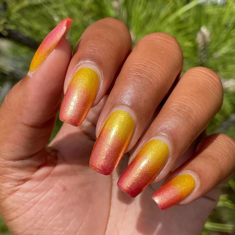 Consider an ombre glitter look to mimic both sunrises and sunsets. You will need shimmery mustard and peach nail polish, a sponge and topcoat. Use a sponge to apply the colors for an ombre effect. Clean it up with a brush and then finish with topcoat.