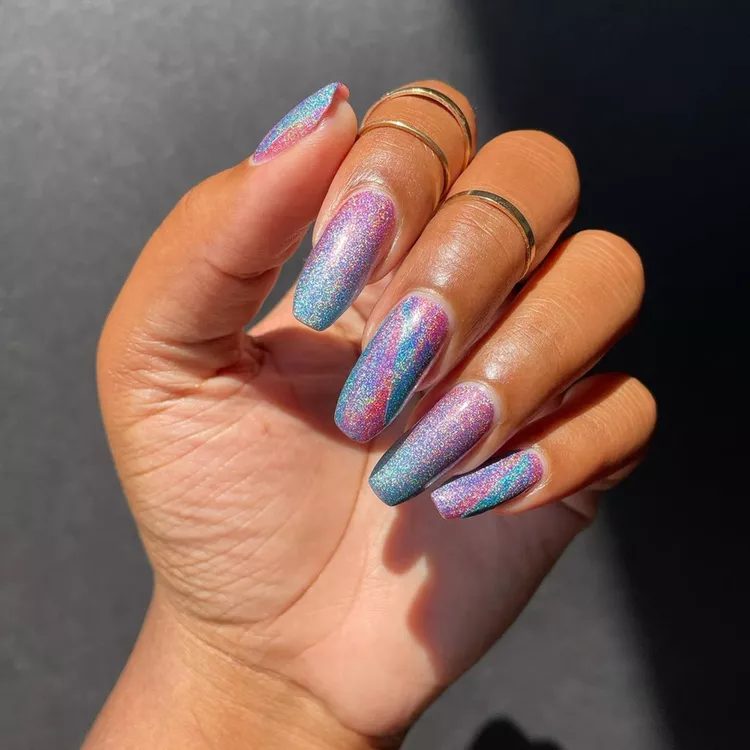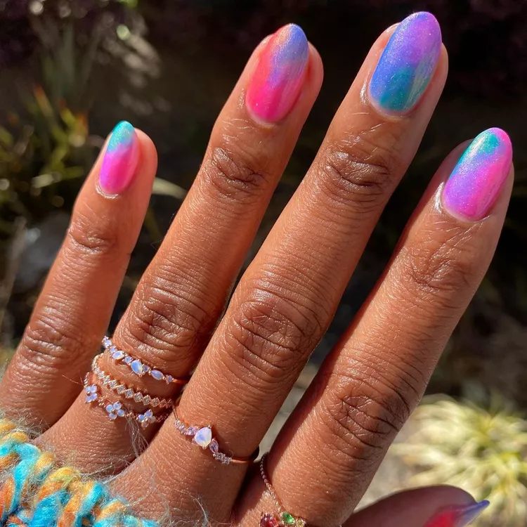 This shimmery tie dye manicure is stunning. The Cirque Colors Collection California Dreamin’ would be perfect if it still existed. If you bring this to a local nail salon they will likely have the colors to create a similar look.