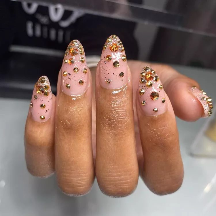 Want to go even bolder with your nails? Add some gold gems to your gold glitter mani. This will give you a 3D mod appearance.