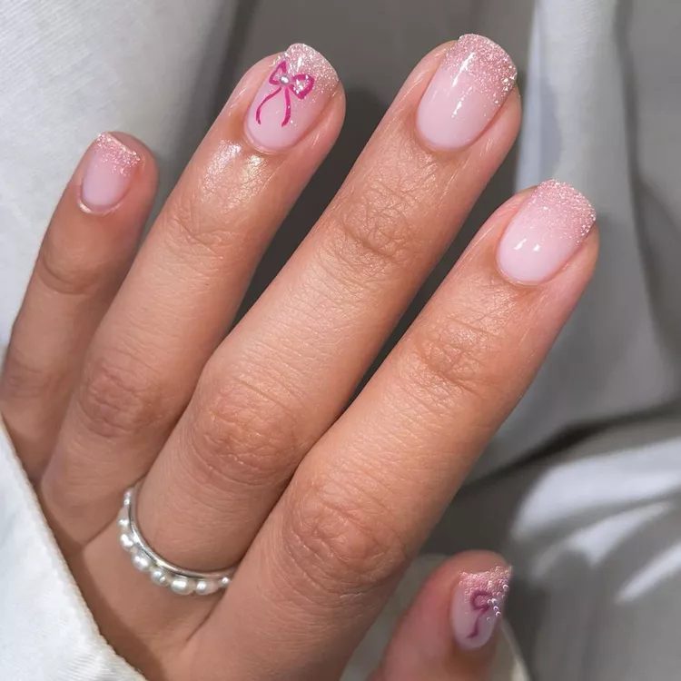 In 2024, balletcore will continue to be a major fashion influence. So, a glitter-ombre manicure is a natural choice. The little bow detail is also a nice touch. The bow detail completed the look.