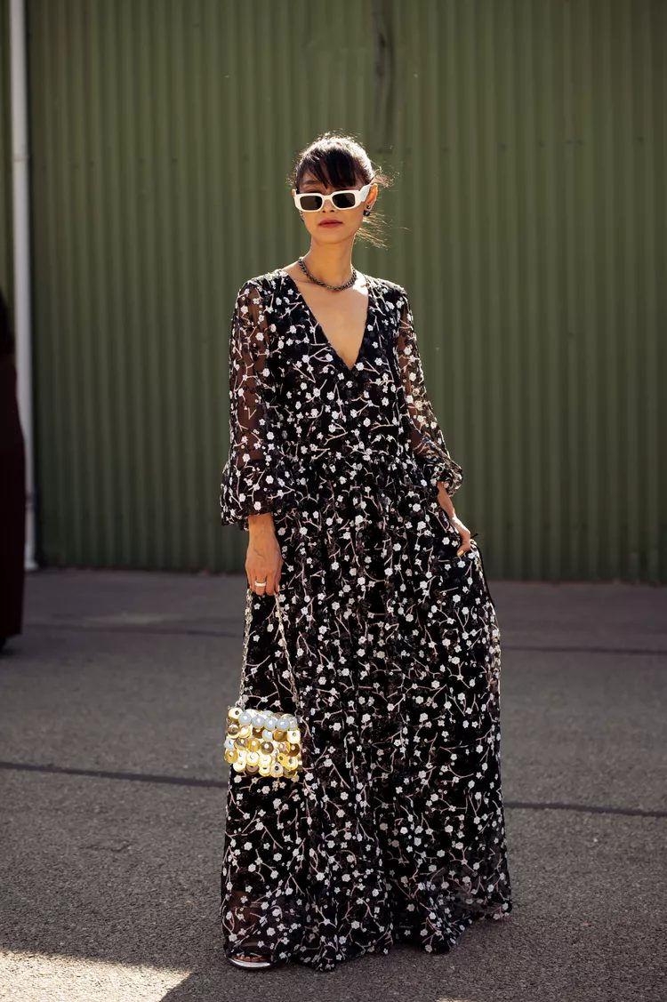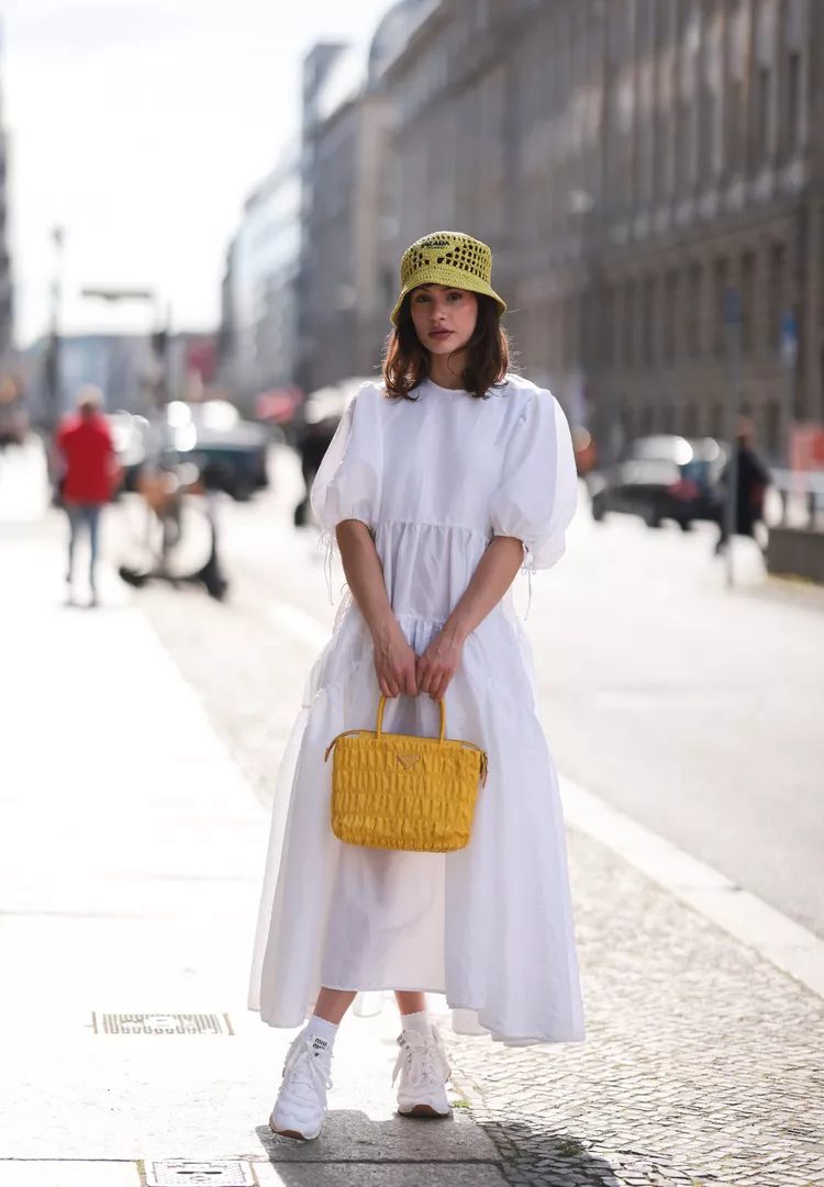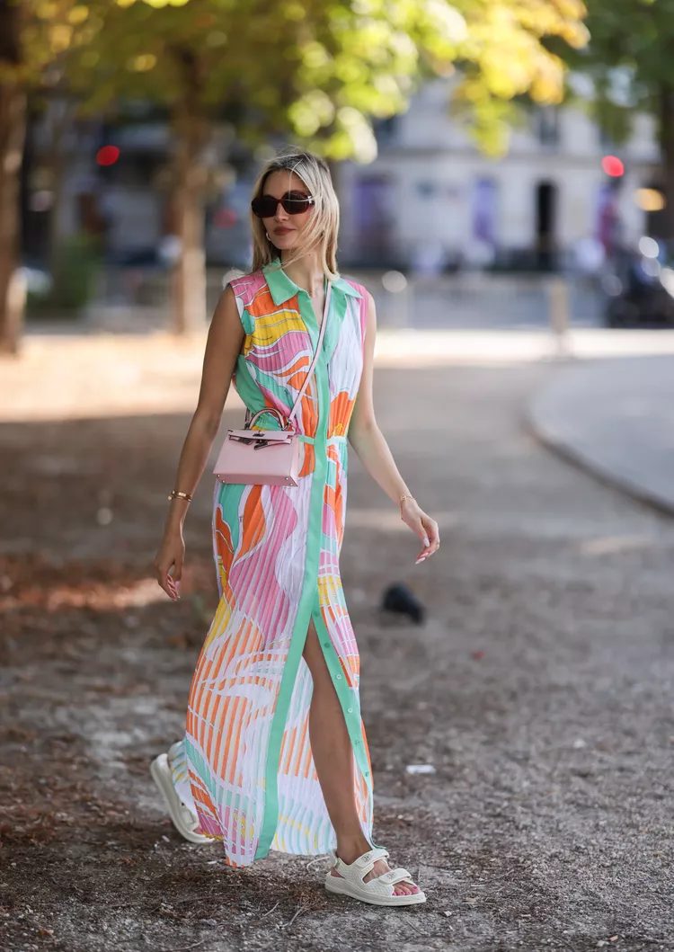 Mix and match laidback accessories to give a maxidress a casual feel. Sneakers, bucket-hats and colorful purses can all be used to inject some fun into the refined silhouette.