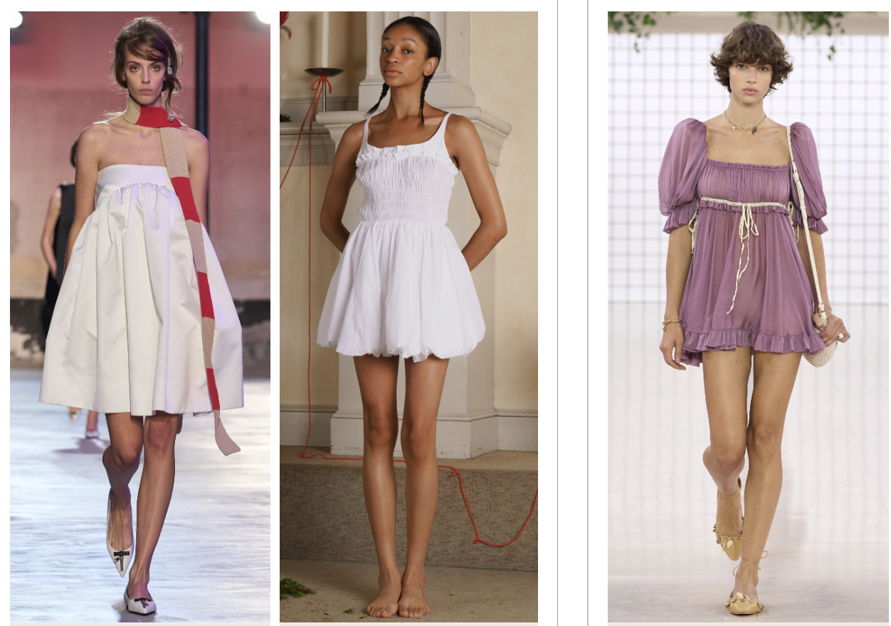 At the heart of this trend lies the ultra-short silhouette, integrated with gown-like elements and presented in soft, voluminous forms, crafting sweet, everyday social looks. Inspired by boudoir nightgowns, the use of lightweight chiffon materials sculpts soft, fluffy appearances. By incorporating uniform-inspired elements,a youthful, endearing aesthetic is achieved, proving that voluminous fashion is not just about size, but about creating timeless, sweet, and social-ready outfits for every day.