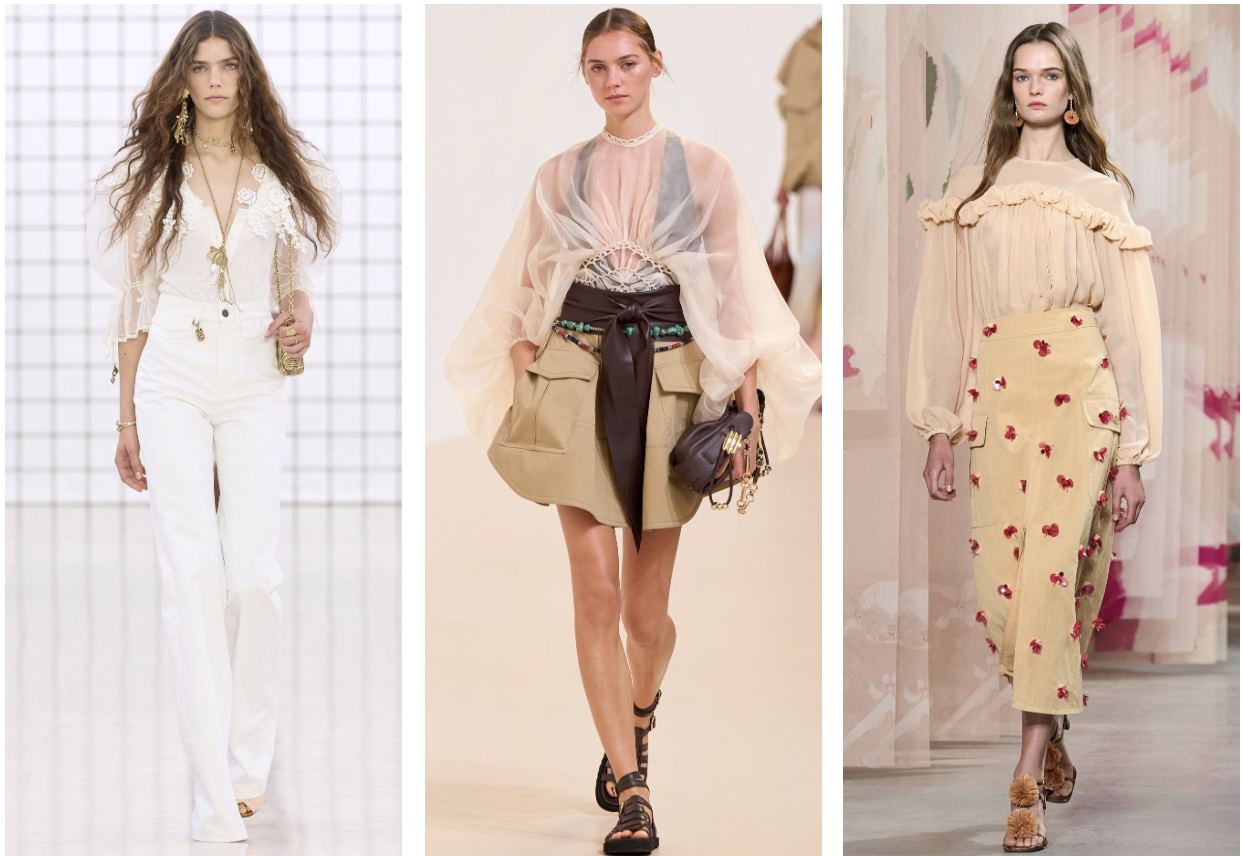 The juxtaposition of statement sleeves with tailored bottoms creates a stark yet elegant contrast in urban fashion. Key pieces this season include ultra-feminine tops, where light chiffons and lace are cut loosely, blending with utility wear to evoke a romantic Bohemian spirit. This freedom of expression, paired with a sense of romance, defines the essence of voluminous fashion.